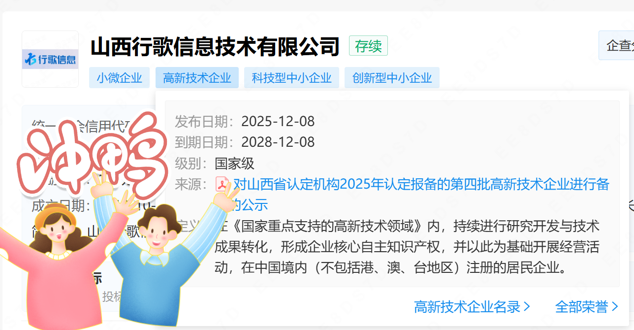近日,山西行歌信息技术有限公司顺利通过国家高新技术企业认定,正式获评国家级高新技术企业。该项认定是对企业技术创新能力、研发体系建设以及科技成果转化水平的综合认可,标志着公司在科技创新和高质量发展道路上迈出了坚实一步。
